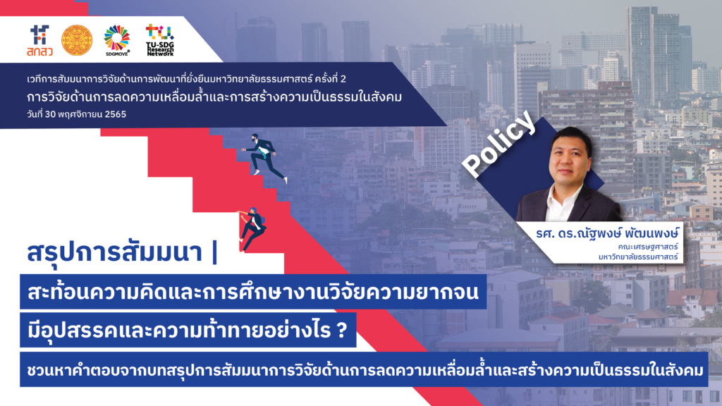 TU SDG Seminars | งานวิจัยจะศึกษาและหนุนเสริมการลดความเหลื่อมล้ำเชิงพื้นที่ได้อย่างไร ชวนหาคำตอบจากบทสรุปสัมมนาการวิจัยด้านการลดความเหลื่อมลํ้าและการสร้างความเป็นธรรมในสังคม